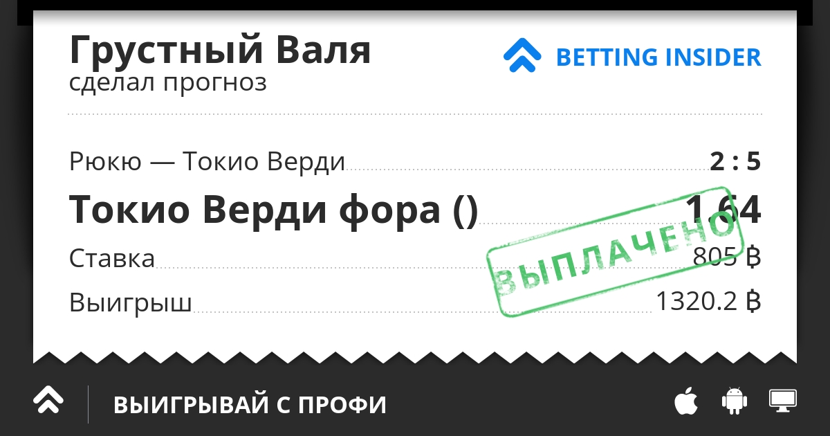 Рюкю на предпоследнем месте и всего одна победа и ничья за шесть матчей. Конечно не всё потеряно ещё, но если будут продолжать в том же духе и с таким же настроем, то со дна и не поднимутся. Токио Верди неплохо стартовали и пока идут без поражений (3+3). Должны сегодня побеждать и если это случится, то надолго задержатся в первой тройке игроков. Крутите барабан ))