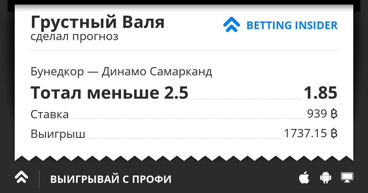 Чет непонятно, где была команда два года. За 20-й и 21-й год всего одна кубковая встреча. Может просто не отображается низший дивизион. Ну да ладно. За три стартовых тура Динамо не забили ни одного мяча, а пропустили три. Сначала думал на ОЗ поставить, должны же когда-то начать забивать, но посмотрев, что отстояли 0:0 против Кызылкума, решил поставить на тотал