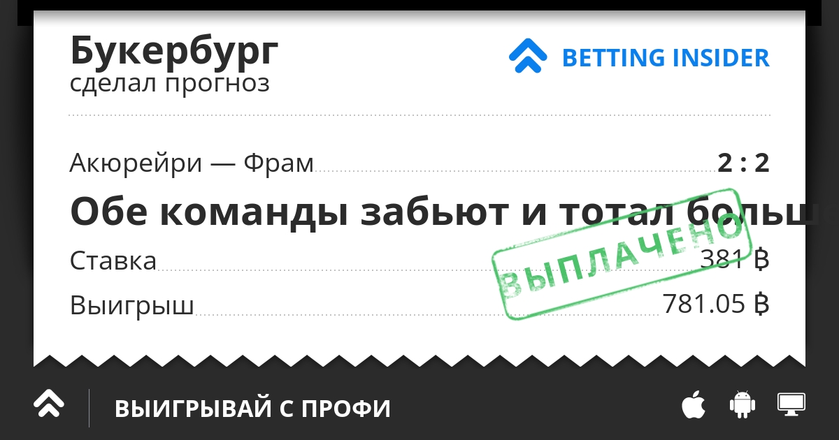 Ставка сыграла в 4 последних матчах Фрама. Но при этом обмен голами был и в пятой их игре. Поэтому ставлю и на то, что и сейчас будет также.