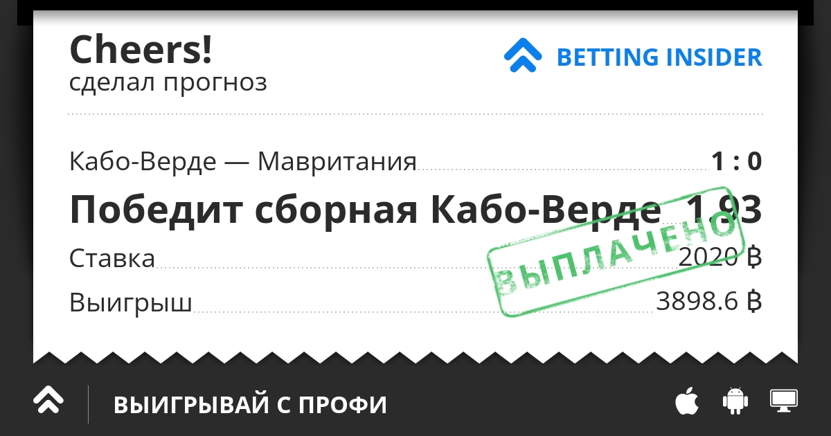 Вопрос не в Мавритании, а силе их соперника Как бы смешно не звучало, но Кабо Верде красавчики: хлопнули Гану, немного расслабились с Египтом..., а это крепкие команды континента Мавриты же вышли благодаря шальной победе над Алжиром (который сдулся после ЧМ) Так что тут можно было бы и побольше ставить, но ограничиваю себя 10% Прогноз 2-0 в пользу КВ