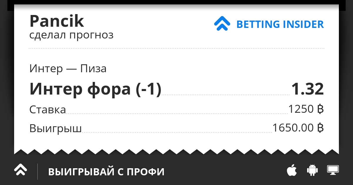 3. Да и Пизу нельзя скидывать со счетов, команда забивает и терять игрокам нечего. Вылет из высшего дивизиона не входил в планы. Поэтому Интеру не хватит одного гола, всё может случиться. Да и дома попали под Арсенал в последнем матче. Думаю команда которая борется за чемпионство должна забивать два и оставить сухими ворота.