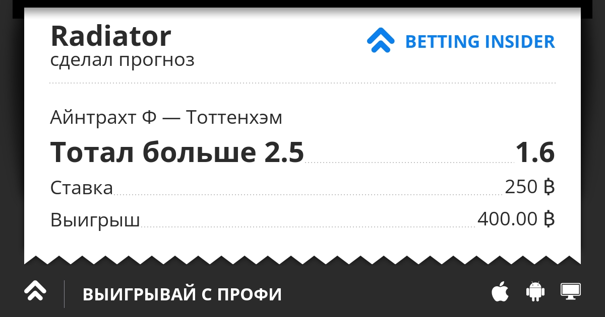 Всем привет! Айнтрахт имеет существенные потери в составе, особенно в обороне, сейчас пропускает очень много голов и скорее всего потерял надежду на ЛЧ, Тоттенхэм тоже не в лучшей форме, но в отличие от соперника имеет хорошие шансы на попадание в 1/8, а для набора очков этот матч отлично подходит, неплохо забивает, поэтому ожидаю не менее трех голов! Так же можно попробовать ОЗ.