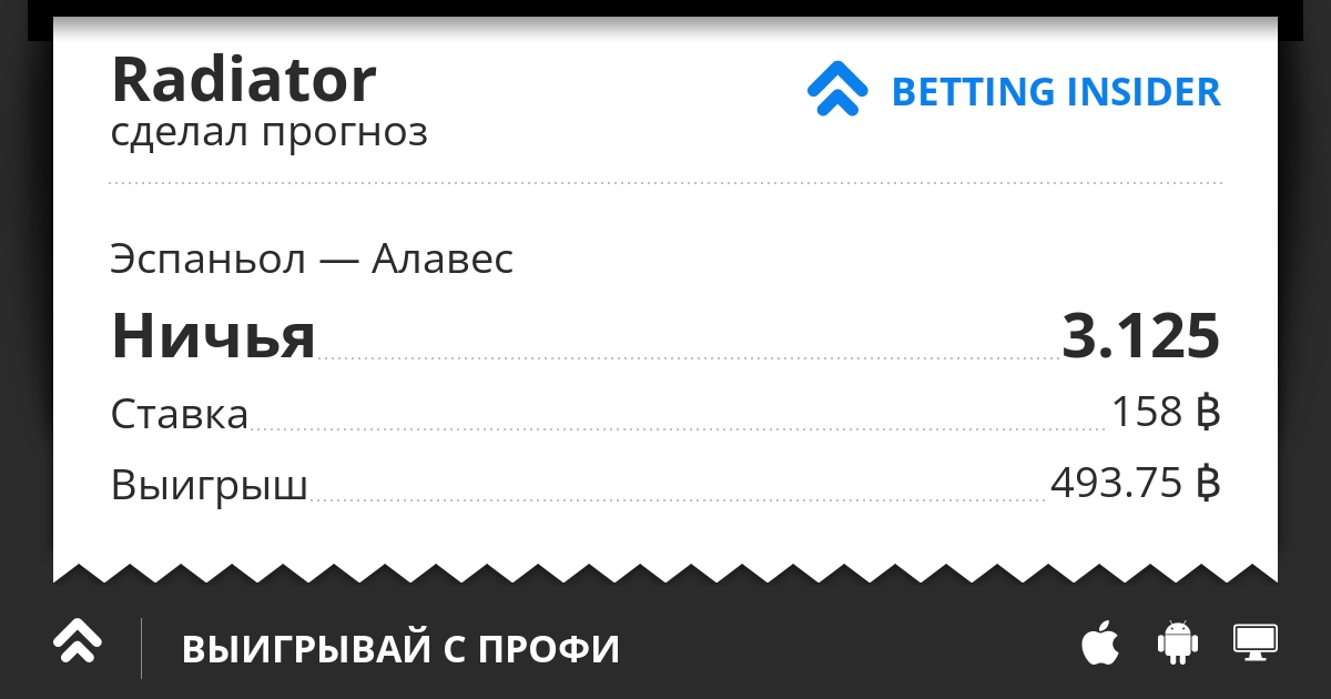 Попробуем рискованную ставку на ничью, очень редко её беру, но в этом матче явного фаворита нету. Эспаньол уже 4 тура без побед, в таблице они на 5 месте, но их форма кажется не стабильной и капитан команды Хуан Пуадо пропустит этот сезон. Алавес всего на 1 балл опережает зону вылета и крайний матч забрал много сил у команды и они смогли забить 2 гола. Можно попробовать ещё ставку х1.