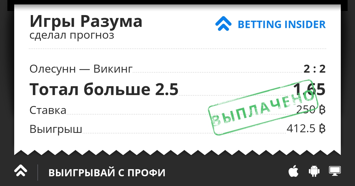 Оттолкнусь от верхового тренда Олесунна. Хозяева сыграли на ТБ2,5 10 матчей из 12 сыгранных в этом сезоне. Средний тотал матча - 4,5. Под стать хозяевам и гости - Викинг сыграл на ТБ2,5 8 из 12 матчей, средний тотал матча - 3,08. Полагаю, что такие верховые команды пробьют тотал, как минимум, в 2 матчах из трех. Я бы брал эту ставку за любой кэф выше 1,51.