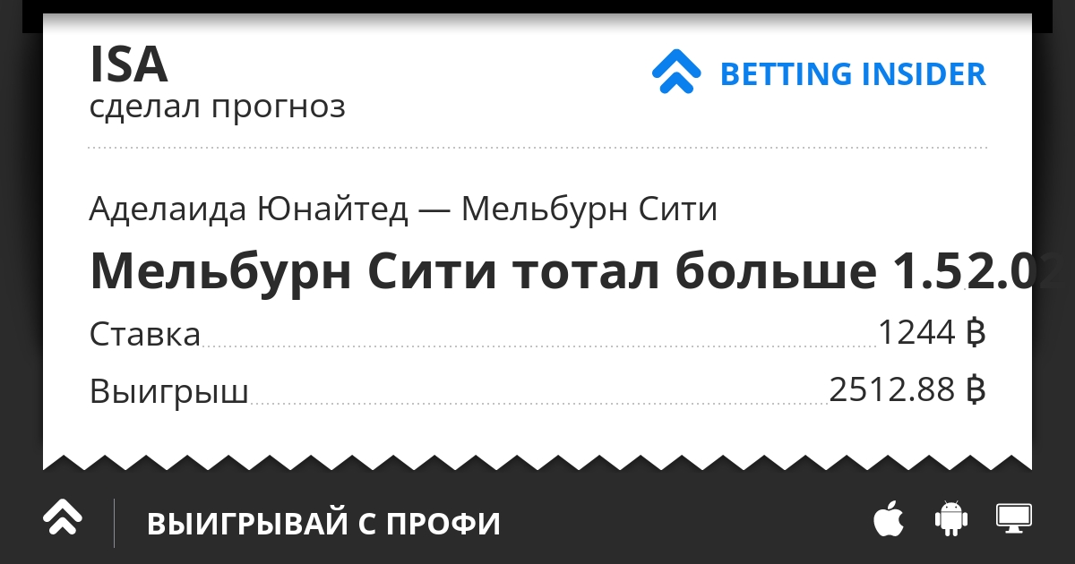 Сегодня у нас Австралия, точнее игра Аделаида Юнайтед ➖ Мельбурн Сити Хозяева играют по-разному, в этом сезоне были несколько раз подряд победы и поражения, но стоить отметить забивают они частенько. Поэтому скорее всего тотал будет больше, но сейчас не об этом! Сегодня поставим на одного из лидеров чемпионата, они же гости Мельбурн Сити. В атаке у горожан убийственная тройка Нун-Макларен-Сусаета, последнего мы помним за игры Атлетик из Бильбао. Прогноз на этот матч Мельбурн Сити 1.5 больше, вся надежда на тройку в нападении. Всем удачи, и прибыльных выходных!!!