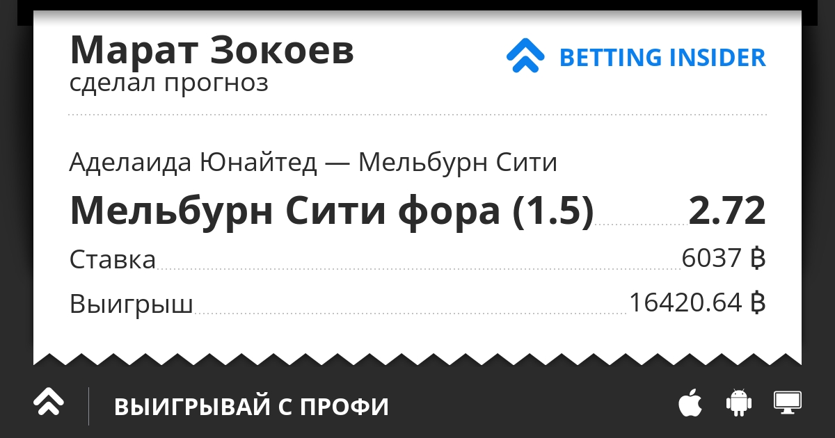 Ну что, дорогие друзья, наш первый прогноз зашел: Вестерн не проиграл Ньюкаслу. Попробуем развить наш успех. Хочу взять +1.5 на Мельбурн. Признаться честно до игры я хотел поставить Х2 на них с кэфом 1.5, но чуйка не подвела. Теперь у нас есть возможность поставить не просто Х2 с кэфом 1.5, а аж +1.5 с кэфом 2.7. Такое грех упускать.