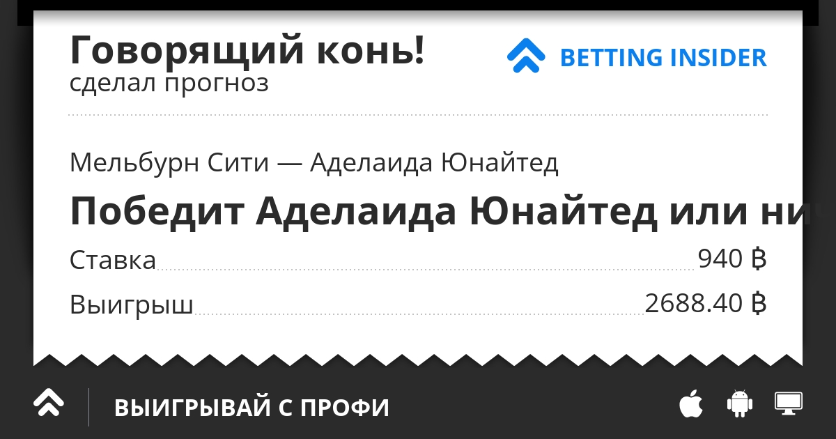 В последнем очном матче, что интересно, Аделаида Юнайтед победила со счетом 2-0. Теперь же фаворитом, разумеется, считается уже Мельбурн Сити. В принципе, команда так идет в этом сезоне, что и здесь должна играть с первых минут очень ярко и постараться реабилитироваться за то поражение. Полагаю, что это, в целом, должно получиться. Да, Аделаида Юнайтед очень хороша, но все-таки на выезде играет хуже, чем дома, так что будет интересно. Но я все таки риску, риск же благородное дело) и поставлю на то что гости не проиграют в этом матче.