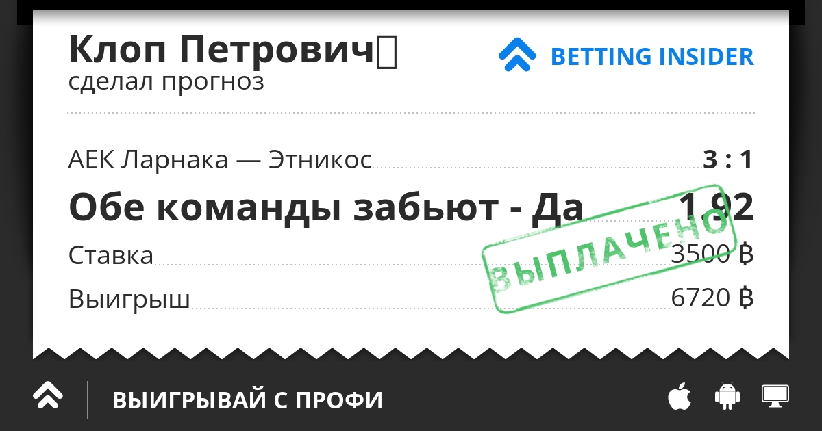 💣 Этникос очень прилично провел последние 4 матча - 3 из которых выйграл. Все 4 матча кстати играли по ставке ОЗ. Сегодня велика вероятно, что парни снова забьют.