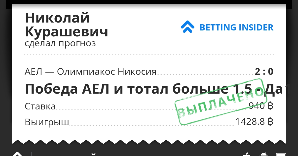 💡Ожидание: - АЕЛ победит и забьет 2 мяча - Не забьет и проиграет Олимпиакос.