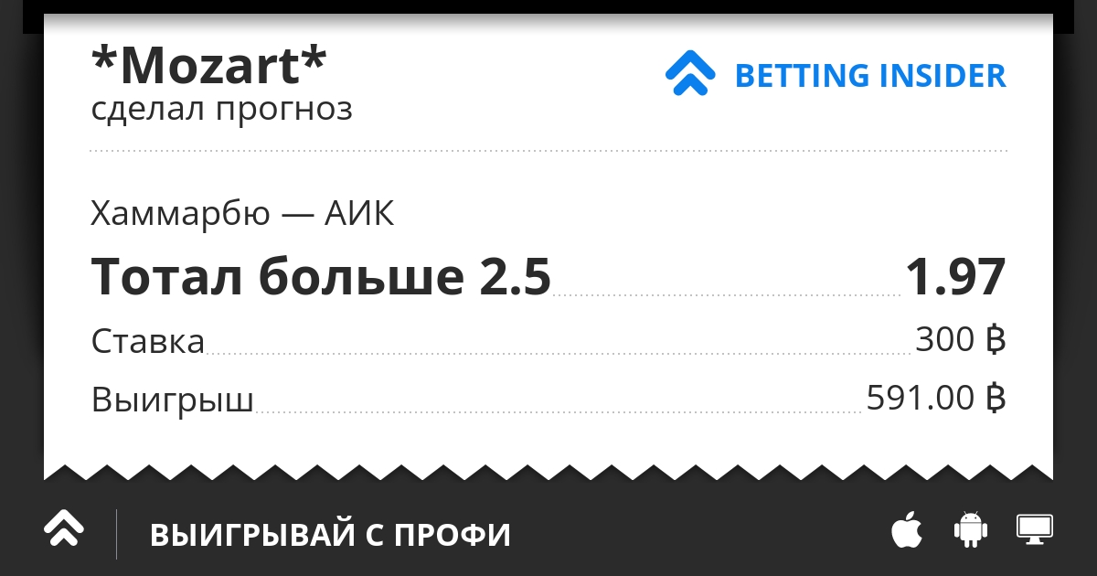 В первую очередь здесь стоит отталкиваться от хозяев. «Хаммарбю» сейчас в хорошей форме, этому клубу удается сходу показывать очень достойный уровень, особенно выделяется линия нападения. На своем поле «Хаммарбю» продолжит гнуть эту линию. АИК после крупного поражения будет осторожничать, однако если команда пропустит, она будет вынуждена раскрываться, а благо в атаке у АИКа есть качественные исполнители. Считаю, что данный поединок порадует нас своей результативностью. Как доказал «Норрчепинг», защиту АИКа не так уж и сложно взломать.