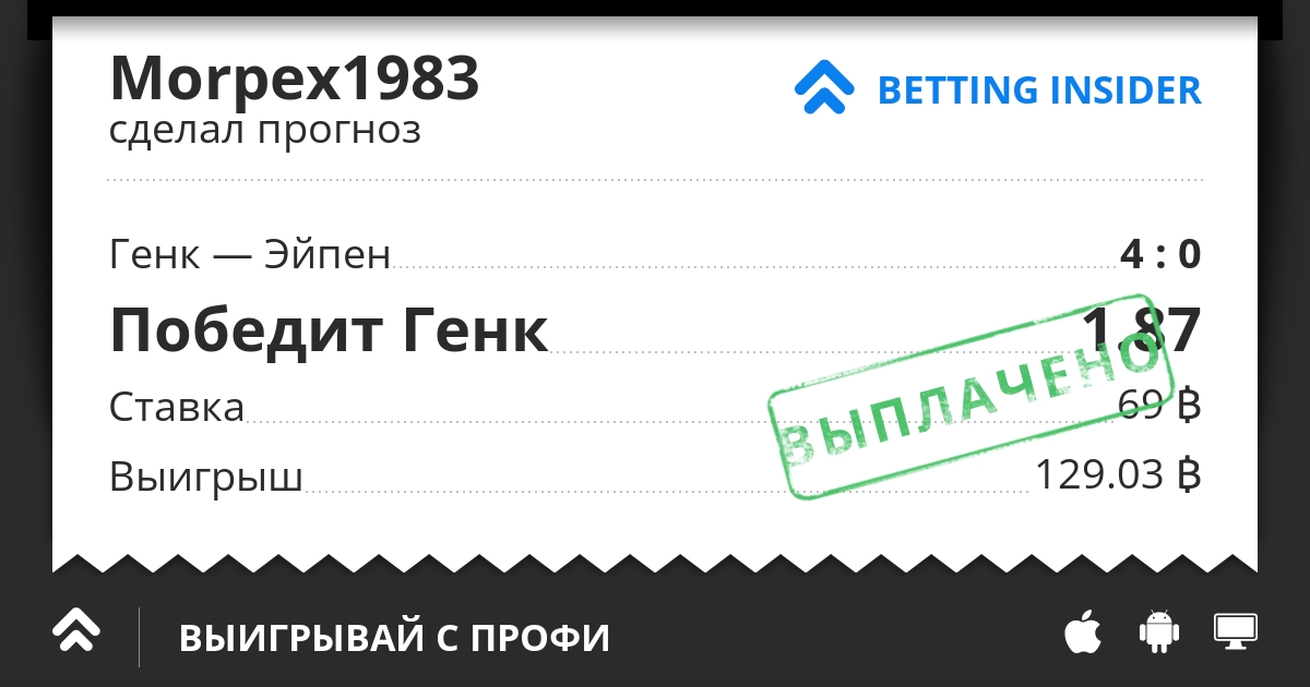 Коэффициенты на Генк кажутся мне завышенными. Всё-таки эта команда намного выше классом, чем Эйпен, к тому же сейчас они явно на подъёме! По личным встречам Генк имеет просто подавляющее преимущество: 8 побед против одного поражения при трёх ничейных исходах. Не думаю, что в этом матче Эйпен сможет что-то противопоставить разогнавшемуся Прогноз победа Генка