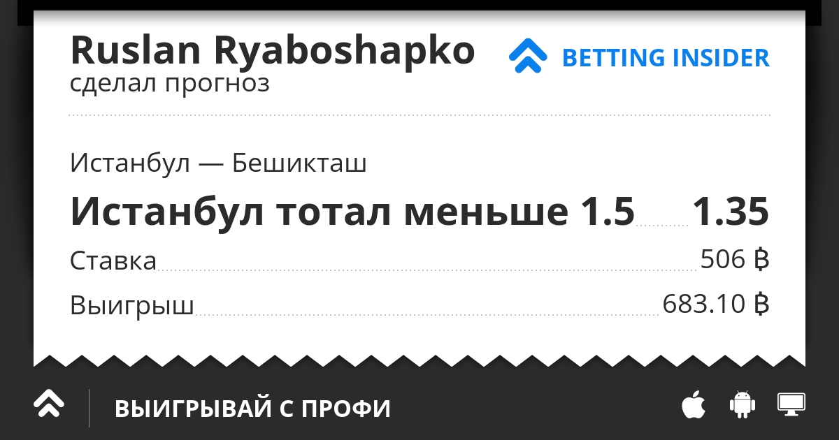 У Истанбула большие проблемы с реализацией моментов. Последний раз Истанбул забивали 2 мяча 15 матчей назад 10 января против Анкарагюджю, команды, борящейся за выживание. У лидера Бешикташа неплохая защита, пропускают в среднем 1 мяч за игру, за последние 5 матчей пропустили 2 гола. Думаю, что сегодня 2ух голов от хозяев мы не увидим. Беру ИТМ1 (1.5) за кэф 1.35 Этот прогноз всего лишь моё субъективное мнение. Всем удачи и думайте своей головой
