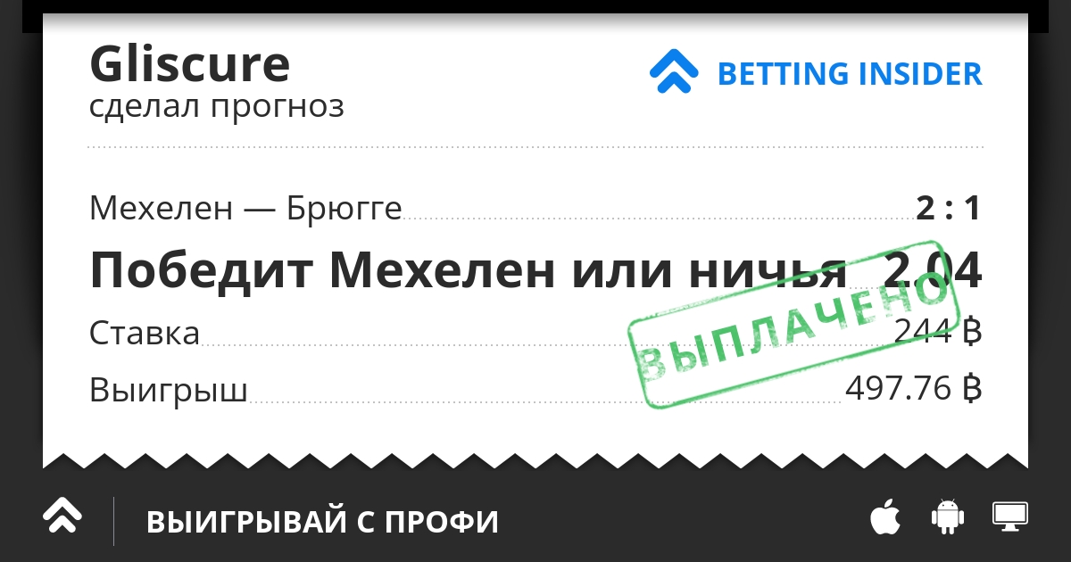 Бельгия, встречаются команды, соседствующие в таблице и уже в который раз я замечаю, что соперников Брюгге явно недооценивают. Верю, что Мехелен способен забить сегодня гостям хотя бы один мяч. Так же вполне допускаю, что хозяева сегодня не проиграют. Коэффициенты на оба события почти одинаковые, поэтому выбор за вами, а я поставлю на оба варианта