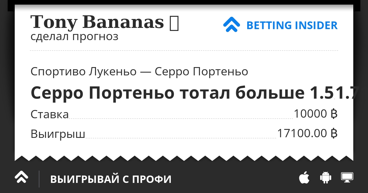 Всем привет мой прогноз на матч Спортивио Лукеньо против Серро Портеньо мой прогноз гости тотал два мяча,с чего такой вывод в двух последних встречах именно гости побеждали с одинаковым счётом 1:2,за последние за последние три встречи гости забили восемь мячей,последняя встреча завершилась разгромом над командой Сан-Лоренсо со счётом 4;0. Так что думаю гости сумеют добыть победу сегодня минимум в один мяч.