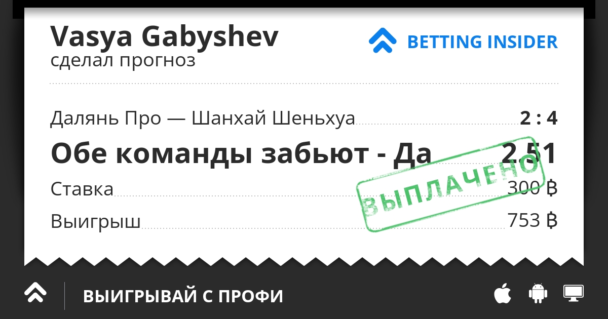 Чемпионат Китая по футболу, попробую жирный КФ на простую казалось бы ставку как обе забьют.дилян 7 место, Шанхай 5 , а кф такие разные)) потому что очков много друг от друга,дилян полный профан , Шанхай относительно неплох. Дилян играет дома,и думаю шансы отличиться у команды будут,пора брать очки,надо идти в атаку, тем более что дилян регулярно огорчает в своих матчах этот же Шанхай . Месяц назад играя между собой дилян 2 забил шанзаб на выезде ,неплохо. И вообще вечно Оз проходят в играх этих команд,любят обидить друг друга,в этот раз я тоже надеюсь ,что и те и те по голу хотя бы положат,в любом случае такой КФ надо играть по моему.
