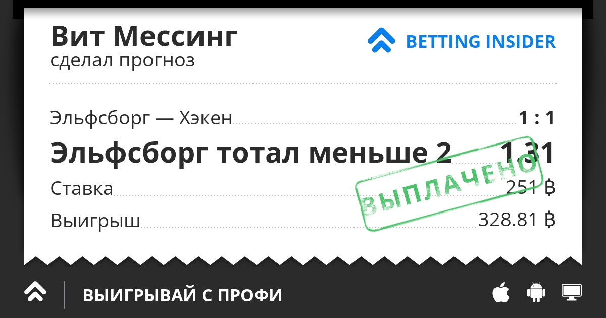Хеккен не только один из сильнейших клубов страны на данный момент, но очень стабильный в плане результатов на дистанции коллектив. В последних 5 играх зафиксированы 4 победы и 1 ничья, при этом 2 победы удалось достичь оставив свои ворота не распечатанными(редкость для Швеции)Факт к данной ставке:Эльфсборг давно уже не забивал дома 2 мяча в играх с Хеккен, да и просто 2 мяча забивают не так часто.Кроме этого у хозяев имеется затяжная серия без победы - 5 игр.Эльфсборг наверняка захочет взять реванш за неудачу в первом круге, но вот удается ли им это сделать...