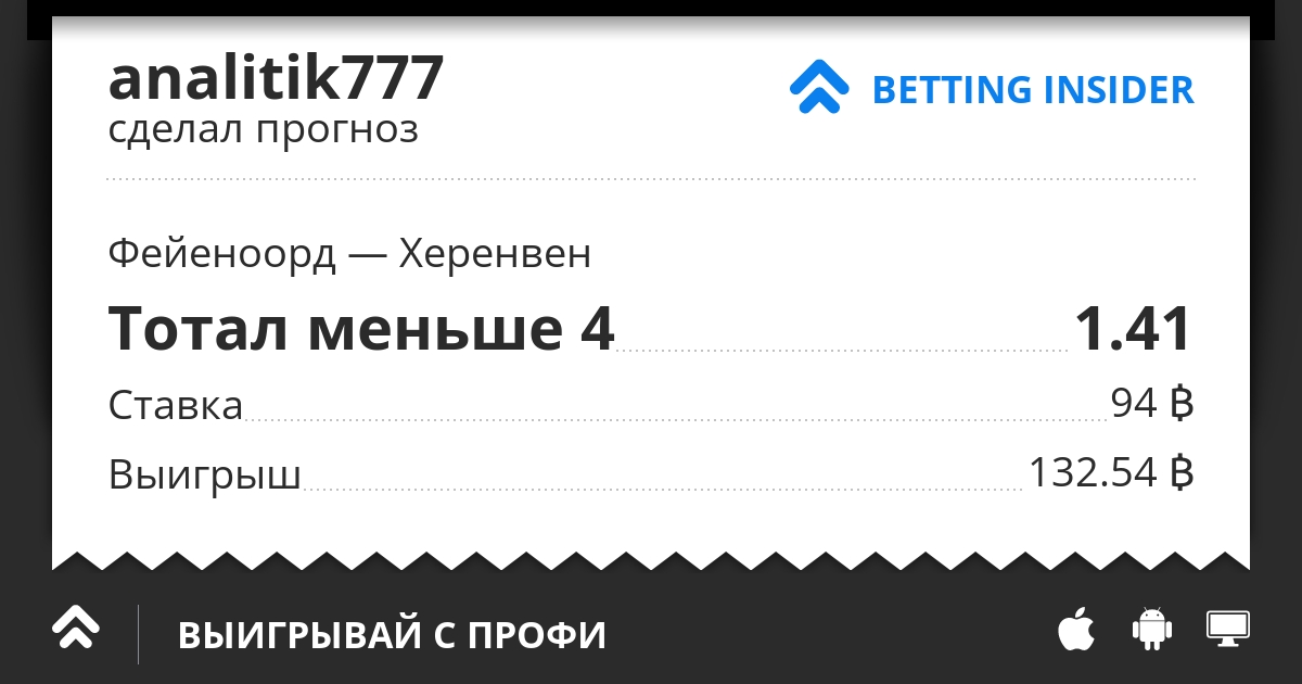 Фейеноорд встречается с хервен а я беру 4меньше и не парюсь) думаю тут счёт 3-0;2-1;0-1 но рисковать не нужно а нужно выигрывать поэтому беру 4тм и без рисков для бабла делаю ставку, анализа не будет тк дома явный фаворит, аутсайдер в гостях всем и так всё понятно, ставим лайк, под писываемся на меня и у вас будет много бабла!) успехов друзья!)