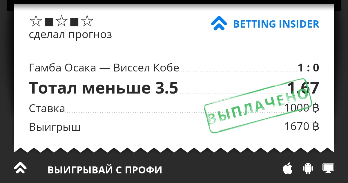 Многие не согласятся с моим прогнозом, да, иногда эти два клуба пробивают большой тотал. Гамба сейчас в отличном положении и обеспечили себе проход в ЛЧ, чего нельзя было сказать в прошлом сезоне. Тем временем Кобе являются середняком, стабильно. И они как раз не на что не претендуют, я так думаю. Сегодня я не жду зарубы, может обе и забьют но предполагаемые исходы события таковы: 2:0 или 2:1 или же 1:2, в большее количество голов я не верю. Хозяева будут сохранять свою позицию и очки, вероятнее всего игра будет в защите. А на что ставить вам, решайте сами.