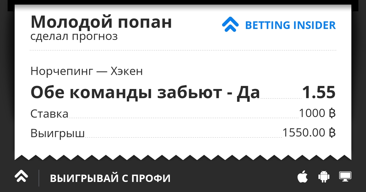 Аллсвенскан, 17 тур, Норрчепинг на своем поле сыграет с Хеккеном. Две забивные команды - разница мячей хозяев 35:23, гостей 29:17. В матчах Норрчепиинга Оз пробивался 13 раз из 16. У Хеккена с ОЗ похуже - 9 раз из 16, но учитывая игру Норрчепинга, который в этом месяце пропустил по 3 мяча от двух последних мест, думаю Хеккен свой мяч забьет. При этом Норрчепинг делит первое место по забитым мячам с лидером лиги Мальме, поэтому и свои моменты хозяева найдут. В этом сезоне команды уже играли между собой, и ОЗ был пробит, 2:1 выиграл Хеккен. Добавлю, что победа нужна обеим клубам, чтобы догнать топ-3, и делаю вывод, что ОЗ - да очень даже неплохая ставка на этот матч.
