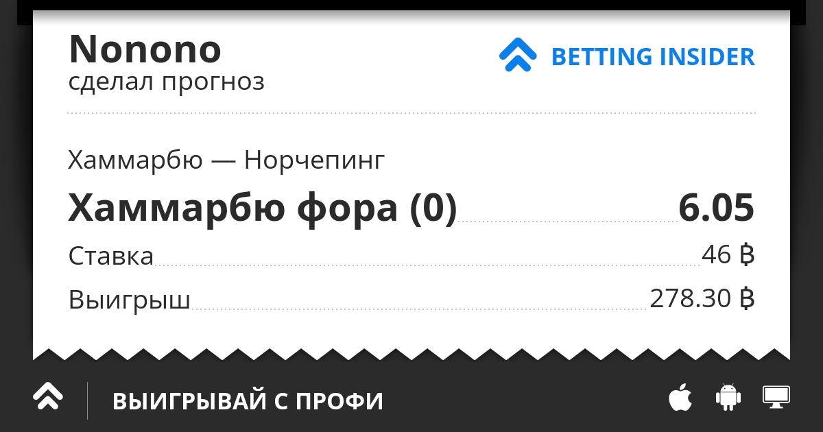 Швеция. Высшая лига. Если честно, Швецкие чемпионаты, что первая, что вторая лига, очень сложные для прогнозирования, лично для меня это так. Может кому то и удаётся делать верные выводы. Но ничего страшного, попробовать можно) Хамарбу проигрывает Норкпингу, идет середина второго тайма. Коэффициент на ничью и на то что обе забьют очень низкий... Возьму фору 0.Рамамбахарамамбуру.