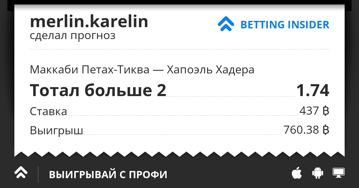 Маккаби хайфа против Хапоэль Тель - Авив, могу дать прогноз на тотал больше, почему? Маккаби играет намного лучше чем его соперник, много забивает, в каждом матче Маккаби забивает минимум 2-3 голов. Поэтому логичнее поставить на тотал больше при этом Хапоэль в последнем пяти матчей ни разу не забивал и сегодня может тот самый день когда наконец то забьют. Минимум 3-4 гола ожидаю в этом матче. Всем удачи!