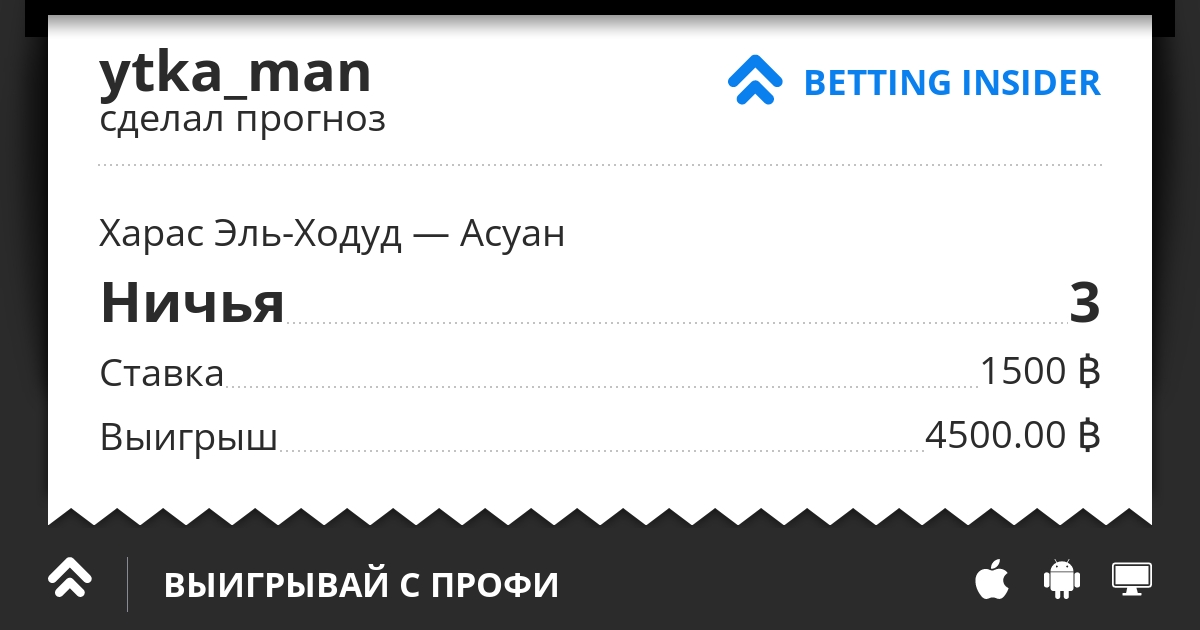 Всем привет .в Египте если посмотреть статистку ,то каждый третий раз команды играют на ничью .из 100 процентов игр всех за сезон ,30 процентов играют на ничью .на данный момент 5 или 6 игр не было ничьи ,поэтому я выбираю стратегию ставить на каждую игру на ничью .начну я с 1500 тысячи и затем буду удваивать .всем удачных ставок .И ПОМНИМ ,что играть нужно только НА БОЛЬШЕ