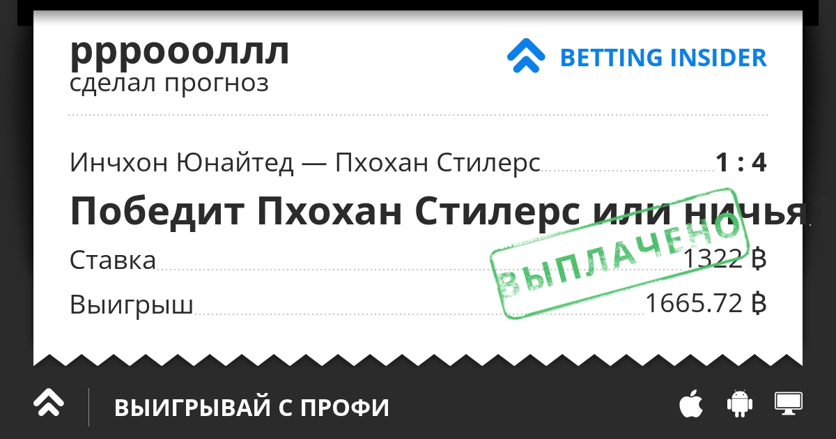 Вашему вниманию участие примут для вас Инчхон Юнайтед vs Похан Стилерс. Расчитав их позиции я понял что БК выбрала фаворита верно да но есть одно НО !!! Инчхон такая команда не предсказуема со своими тараканами захочет выйграть сделает все поверьте она может. Вот мои результаты : Инчхон составил 19,6% ничья 48% Похан 32,2 % так что я остановился на 2 Х всем удачи)))