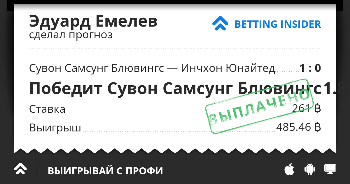 «Инчхон Юнайтед» пока не побеждал в новом сезоне К-Лиги. Обе своих встречи, «Юнайтед» завершил нулевыми ничьими, однако, в таблице расположился выше грозного «Сувон Блюуингз». «Синие Крылья» не смогли победить в стартовых турах. Справедливости ради, в обеих встречах «Сувон» не выглядел аутсайдером и проигрывал с минимальной разницей. Так уж распорядился случай, что в первых матчах Лиги, «Синим Крыльям» в соперники достались чемпион и обладатель серебряных медалей прошлого первенства. Теперь, когда в гости едет команда классом ниже, «Сувон» должен уверенно обыгрывать оппонента. «Инчхон Юнатед» в своей нынешней форме едва ли тянет на звание андердога. Ставка на победу «Сувон Блюуингз» выглядит обоснованно.