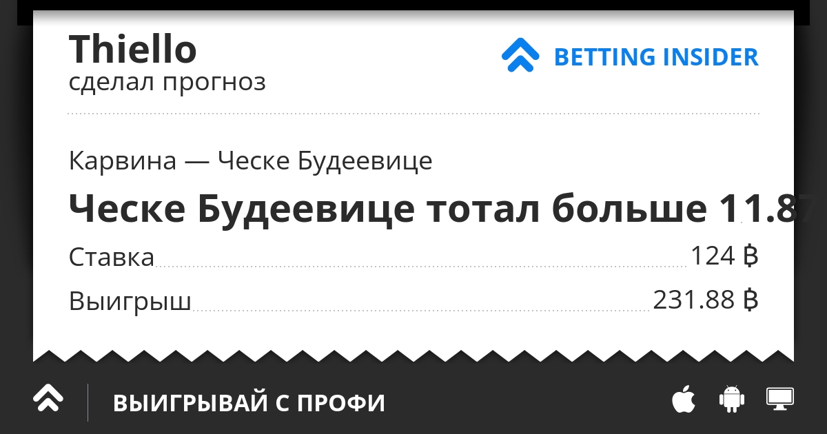 Чемпионат Чехии 🇨🇿Первая Лига28-й турКарвинаСтадион "Городской" 🏟️(Прогноз без описания)"Карвина" (Карвина) - "Динамо" (Ческе-Будеёвице)Ставка на матч{Индивидуальный тотал "Динамо" больше 1}