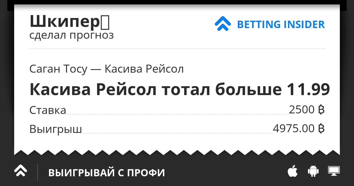 "Саган Тосу" здорово стартовал в чемпионате, но серьезных приобретений не делал. По сути, перед нами все тот же сброд посредственных футболистов, которых сумели расставить по местам и эмоционально накачать. Через пару туров этот заряд иссякнет и "Саган" начнет планомерно опускаться по турнирной таблице. Что касается "Касивы", то сейчас гости явно занимают не свое место. Да, команда гостей тяжело переживает уход своего главного бомбардира, а ведь равноценной замены "Касива" не подписала. Тем не менее, я ставлю на то что "Саган" пропустит свой первый мяч в чемпионате.