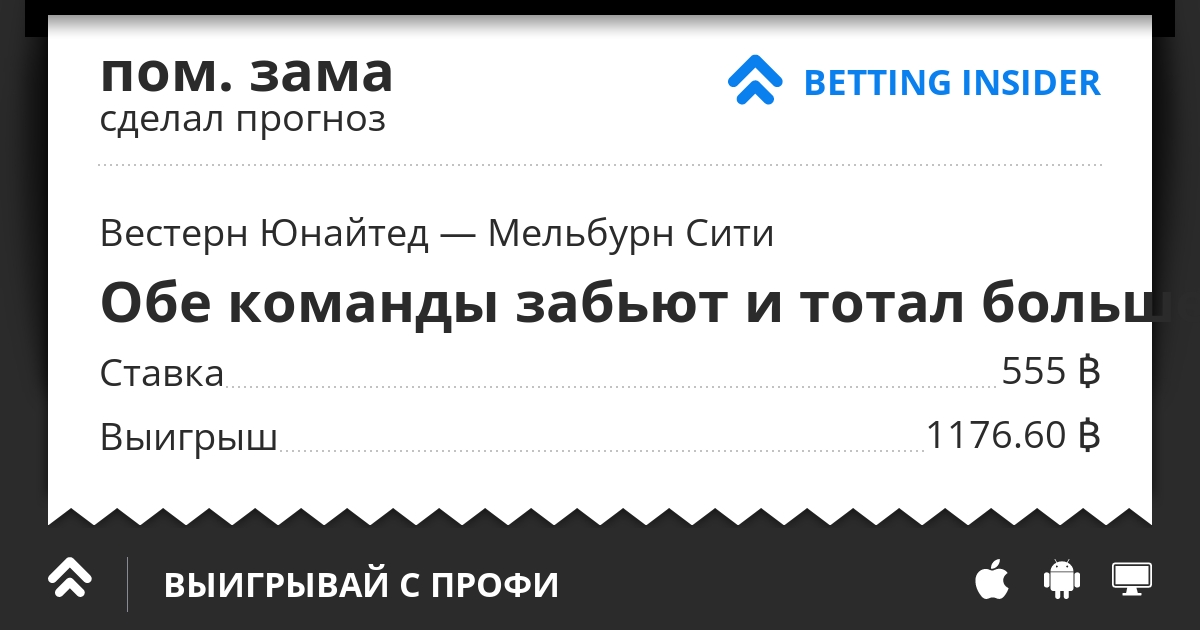 Эти же команды наоборот находятся в лидерах чемпионата и разница у них всего одно очко. У Вестерн Юнайтед конечно странные показатели, если они выигрывают, то только 1:0, ну а проигрывают с большим счётом и обязательно забивают один. Вот мне почему-то кажется, что сегодня Вестерн проиграет, но обязательно забьёт. Можно было бы и нет а победу Мельбурна поставить, кэфф почти такой же, но эти парни тоже могут расслабиться