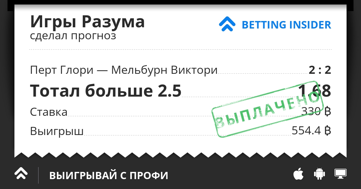 В родных стенах Перт Глори забил 14 и пропустил 8 мячей, в среднем 3,66 за игру. Статистика домашнего Перт Глори по нашей ставке - 4+2-. Мельбурн в гостях забил 8 и пропустил 13 мячей, в среднем 3,5 за мяч. Статистика по ТБ2,5 - 5+,2-. Оцениваю вероятность ТБ2,5 в данном матче в 60-65%, имеет смысл ставить с кефом выше 1,65.