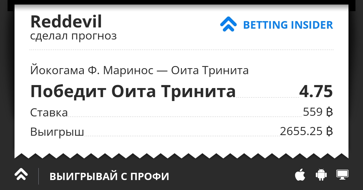 Иокогама М.-Оита Коэффициенты на исходы и вероятности по ним: П1-1,6 (60%) Н-4,55 (20%) П2-4,75 (19%) Рассчитаем вероятности по играм дома и на выезде, и сравним. Средние показатели у домашних команд: Забитые голы за матч-1,51 Пропущенные голы за матч-1,51 У гостей соответственно также 1,51 на 1,51. Иокогама М. дома: Забитые-2,15 Пропущенные-1,54 Получаем силу команды относительно лиги: Атака-1,42(сильная) Защита-1,02(средняя) Команда выше среднего уровня, сила в атаке. Оита в гостях: Забитые-1,5 Пропущенные-1,5 Получаем силу команды относительно лиги: Атака-0,99(средняя) Защита-0,99(средняя) Середняк лиги, сбалансированная команда. Из сил команд получаем прогнозируемые тоталы: Иокогама М.-2,14 Оита-1,53 Наиболее вероятный счёт-2:1(9%) Из прогнозируемых тоталов получаем коэффициенты и сравниваем с предложенными букмекером: П1-1,92 (1,61 по БК) Н-4,76 (4,55 по БК) П2-3,57 (4,75 по БК) Как видим недооценена победа гостей. По рассчитанным коэффициентам-3,57; дают аж 4,75. Рассмотрим её для ставки. В среднем в лиге гости выигрывают 44% игр. Рассмотрим показатели у данных команд, должны быть не худе средних в лиге. Иокогама М. дома проиграла 5 из 13 игр(38%, что на уровне среднего в лиге). Дома набирают 1,54 очка за игру, в гостях 1,4 очка. Дома набирают совсем немного больше. Оита в гостях выиграла 4 из 10 игр(40%, что на уровне среднего в лиге). В гостях набирают 1,3 очка за игру, 1,36 дома. В гостях играют примерно также. Оита на выезде играет уверенно, нет проблем ни в атаке, ни в защите, сбалансированная команда, может создать проблемы любой команде.