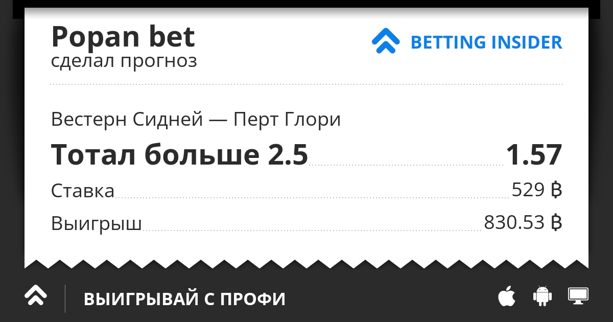 Добрый день, в чемпионате австралии забивают очень много голов. Так и в этом матче я жду результативной игры. Гости, команда Перт Глори одержала пять побед подряд, забивая ну минимум по 3 гола в каждом матче. Из соперники же, находящиеся на 9 месте в чемпионате не представляют особо непробиваемый коллектив. Потому я помимо основной ставки на победу Перт Глори возьму ещё Тотал больше