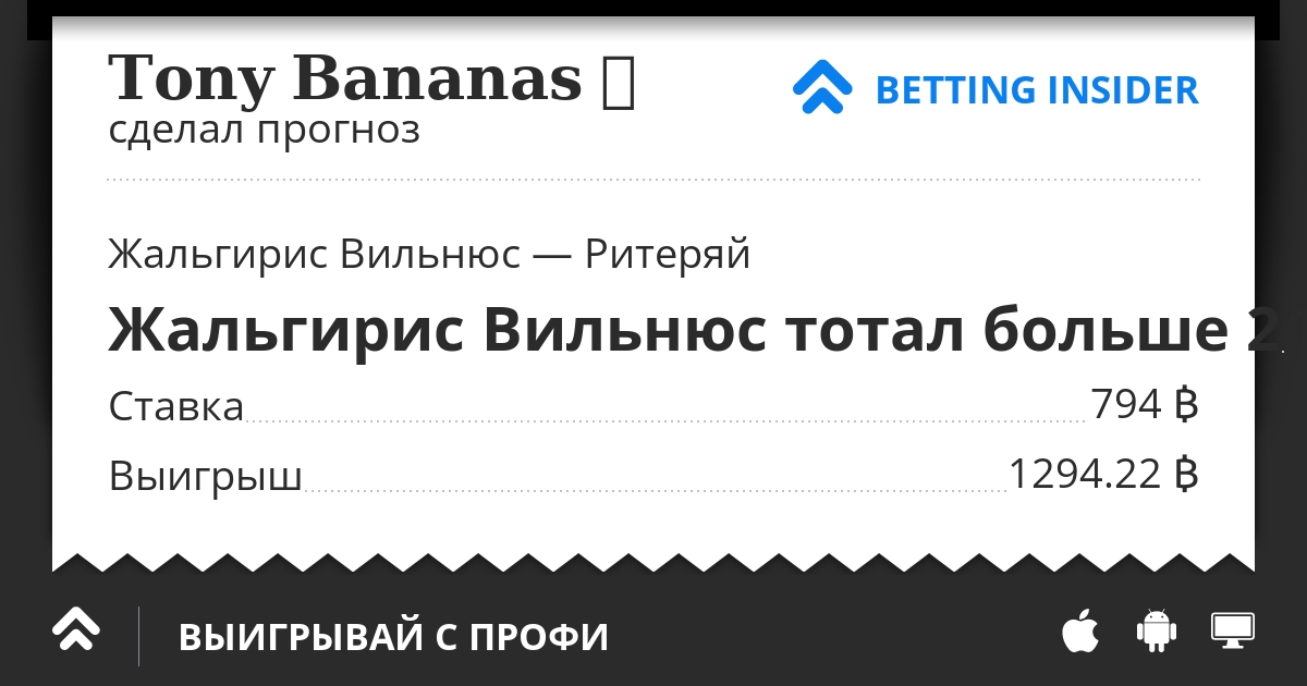 Прогноз 𝐓𝐨𝐧𝐲 𝐁𝐚𝐧𝐚𝐧𝐚𝐬 🍌: Матч Жальгирис Вильнюс — Ритеряй