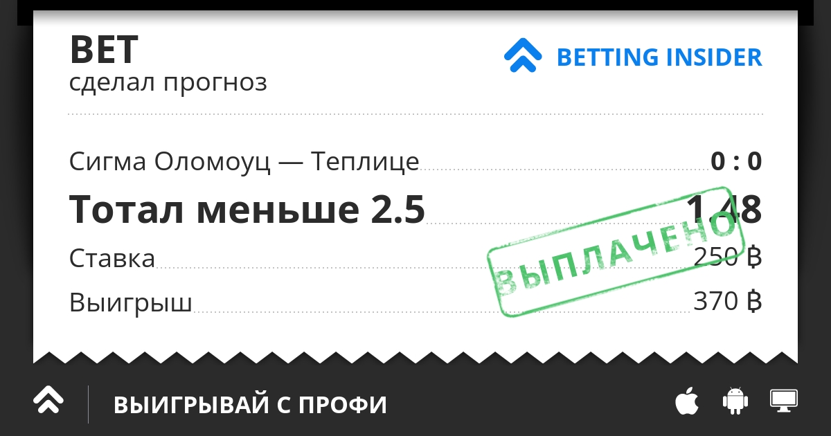 Очные противоборствах Сигмы и Теплице в последнее время получаются достаточно "сухими" - в 4-ех последних междусобойчиках только однажды было забито 3+ гола. На мой взгляд, в этом сражении яркой игры вновь ждать не стоит - ставлю на тотал меньше 2.5 за весьма неплохой коэффициент!